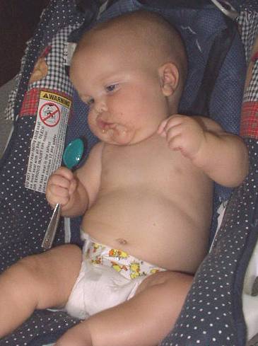 Mary was trying to sing with her spoon. (looks like she is trying to snap her fingers also)